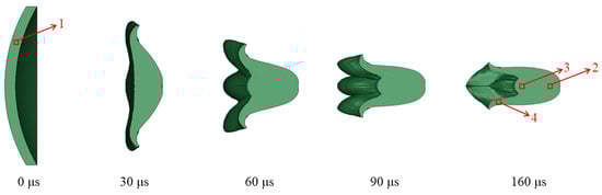 In the previous work, the formation process of an EFP with fins simulated using LS-DYNA is shown in Figure 6. The final stable EFP by numerical simulation was basically consistent with the morphology parameters of the recovered EFP []. Due to the deformation and stretching of the liner mesh during the formation process of EFP, resulting in inconsistent distortion of the final mesh and an unsuitable aspect ratio of the mesh for simulating high-velocity penetration phenomena, the FEM-SPH algorithm was used for the calculations. The SPH algorithm not only ignored the influence of mesh distortion on the calculation results during large deformations, but also prevented the problem of mass imbalance caused by deleting elements when Lagrange elements failed []. The EFP was modeled using the SPH algorithm, while the target was modeled using the Lagrange algorithm. The shape parameters of the EFP formed in LS-DYNA were extracted and imported into AUTODYN, where SPH particles were filled according to the shape. The particle size of the EFP body was 0.6 mm, generating a total of 21,980 particles. The mesh size of the interaction area between the steel target center and EFP was 0.8 mm, and the mesh size away from the center area gradually increased. Due to the physical structure’s symmetry, a ½-size model was used for the calculations, significantly reducing the complexity of the modeling process and improving computational efficiency. The velocity variation was monitored by setting Gaussian points at the projectile tail. The final simulation model of the EFPs penetrating multi-layer composite steel targets is shown in Figure 7.