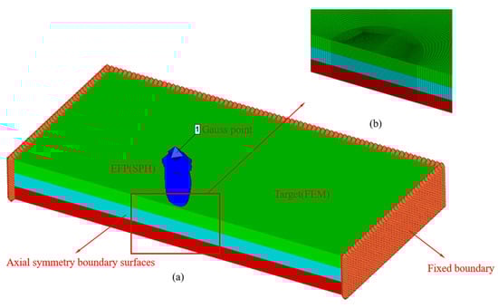 As a common numerical simulation method for studying the high-velocity impact of projectiles on metal targets, the finite element method (FEM) has been successfully applied to modeling the penetration of rigid projectiles with limited plastic deformation into targets [,,]. However, EFPs will exhibit mushroom-shaped deformations upon impact [], and during the penetration process, the main body of the EFP typically undergoes plastic deformations exceeding 300%, or even complete fragmentation []. Due to restrictions imposed by mesh distortion and negative volumes, FEM is not well-suited for accurately describing the high-velocity impact behavior of EFPs. Therefore, it is necessary to seek an alternative method to FEM for simulating such complex scenarios. Smoothed particle hydrodynamics (SPH) [,,], as a completely mesh-free method, is capable of simulating large deformations and material fracture, making it advantageous for modeling the high-velocity impact of soft medium projectiles, including EFPs. Xiao et al. [,] employed SPH to investigate the penetration characteristics of conical projectiles into single-layer and layered Weldox 460 E steel targets. Remennikov et al. [] utilized an SPH-FEM approach to construct a numerical model for EFP penetration into steel–concrete targets, providing significant insights into the interaction between the steel plate, concrete core, and the EFP. Scazzosi et al. [] simulated the impact of a 0.308 Winchester bullet on two-layer steel/aluminum targets, and compared the single FEM method with the SPH-FEM method. They found that the SPH-FEM method was more accurate in describing the extreme deformation of the projectile and predicting its residual velocity.