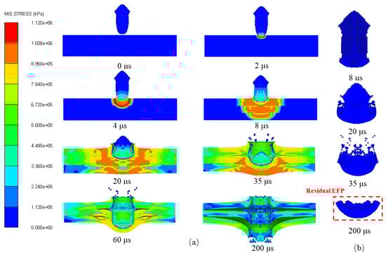 The numerical simulation results of high-velocity penetration into multi-layer steel targets by EFP are shown in Figure 9. The moment when the head of the EFP was 2 mm away from the target was considered as the moment of penetration initiation. When the EFP interacted with the target, the high ductility and low strength of the EFP caused its head to begin transverse plastic flow deformation, forming a distinct mushroom shape at 8 μs. As the head diameter of the EFP gradually increased, the target material at the projectile–target collision point continued to flow radially at a high velocity, leading to further enlargement of the crater diameter. Meanwhile, as shown in Figure 9a, due to the discontinuity of the multi-layer targets, the propagation of stress waves inside the targets formed a distinct layered shape, which was also one of the important reasons for the different anti-penetration capabilities of multi-layer and single-layer targets []. As the penetration depth increased, some EFP materials began to adhere to the surface of the crater. When the dense part of the EFP body was completely eroded, the material in the hollow part of the tail continuously flowed into the dense part to supplement its erosion loss, and synchronously flew towards both sides to participate in the cratering, as shown in the evolution of the EFP morphology at different moments during the early stage of penetration in Figure 9b. While the EFP penetrated the middle, second layer, the contact between the layers caused a bulge on the back of the third layer, as shown at 35 μs in Figure 9a. The failure mode of a limited single-layer target penetrated by EFP was mainly adiabatic shear forming a plug [], while for multi-layer targets, due to the rapid decrease in bending stiffness of the layered targets [], different layers of targets underwent varying degrees of bending deformation during the impact process, and the main failure modes transformed into adiabatic shear and disk-like bulging, as shown at 200 μs in Figure 9a.