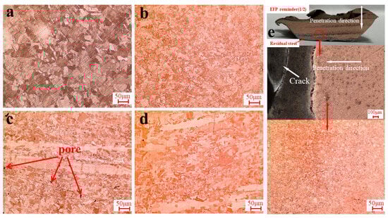 Figure 10a–d, respectively, exhibit the metallographic structures at positions 1 to 4 in Figure 6, along with the microstructure of the recovered residual EFP. Figure 10a reveals the original grains of copper, which were uniformly distributed and exhibited an equiaxed crystal structure. In Figure 10b,c, significant deformation was observed in the grain structure of the head and middle sections of the formed EFP, manifesting as slender grains. The direction of tensile deformation aligned basically with the EFP forming direction, indicating that EFP formation underwent a dynamic recrystallization []. Furthermore, the grain structure in the middle section appeared not only slender but also exhibited a higher number of pores, suggesting that the middle of EFP experienced greater plastic deformation and a high-temperature melting process. Figure 10e displays the residual EFP recovered from the experiment in Project 2, corresponding to the tail of an EFP. The head of the residual EFP was attached to a certain thickness of target material and accompanied by obvious cracks. By comparing the three stages of formation, before and after penetration in Figure 10a,b,e, it can be observed that the copper underwent multiple dynamic recrystallizations, resulting in a significant reduction in the average grain size: from 40 μm to 20 μm in the tail of EFP, and further down to approximately 10 μm in the residual EFP.