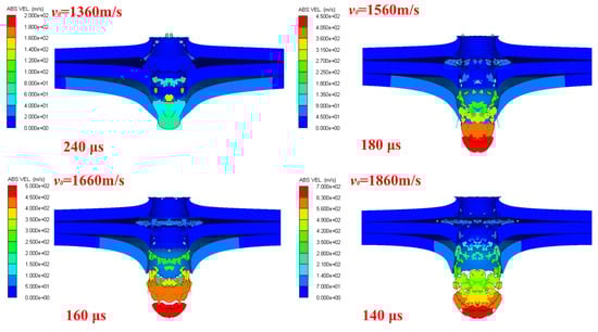 Generally, when an EFP warhead conducts a top-attack, it has a certain standoff distance []. Considering the velocity decay during the flight of EFPs and the velocity disturbance during the explosion, the impact velocity of EFPs against the target is often inconsistent with its formation velocity. Figure 11 displays the cloud maps of EFP penetration into a three-layer steel target at four velocities: 1360 m/s, 1560 m/s, 1660 m/s, and 1860 m/s. With the increase in the initial impact velocity v0 of the EFP, more significant deformation and fragmentation appeared during the penetration of the multi-layer targets. This phenomenon not only caused the residual EFP after penetration to gradually decrease in residual length as the residual velocity increased but also resulted in the continuously expanding range of the fragment cloud generated by post-penetration.