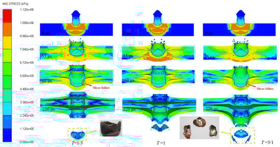 To analyze the impact of front–rear target thicknesses on the ballistic performance of EFPs, simulations were conducted to study the penetration process of three multi-layer targets with different front–rear target thickness ratios in the experiment, as depicted in Figure 12, where T represents the front–rear target thickness ratio. According to Figure 12, at 8 μs, due to the discontinuity in the propagation of stress waves between the layered targets, changes in the front–rear target thickness ratio led to variations in the propagation of stress waves across different layers. Additionally, the different thicknesses of the rear target altered the composition of the plug behind the target. After the EFP penetrated the target, a composite target with a thicker rear target would produce a plug closely associated with the residual EFP, primarily consisting of the rear target material. When T = 3, the rear target was thinner, due to insufficient support, the plug formed by the middle layer penetrated the target together with the residual EFP, as seen in Figure 12 at 220 μs.
