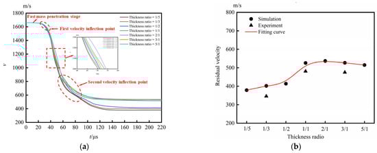 Velocity variation and residual velocity of EFP. (a) The change curves of the tail velocity; (b) residual velocity of EFP under different target thickness ratios.