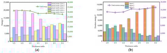 Energy distribution of the targets as the change in thickness ratio. (a) Energy absorbed by target plate. (b) Energy dissipated by target plate erosion.
