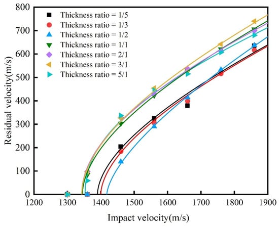 Additionally, the relationship between impact velocity and residual velocity largely reflected the anti-penetration performance of the targets. To better analyze this influence, this study plotted the relationship curve between the residual velocity of the EFP and the impact velocity under different thickness ratios of the three-layer targets, as shown in Figure 15. It can be seen from the figure that the anti-penetration performance of the three-layer targets with a thickness ratio less than one was significantly better than that with a thickness ratio greater than or equal to one. Although the impact velocities of different EFPs caused slight differences in the order of residual velocities for multi-layer targets with different thickness ratios, overall, the influence of thickness ratios on EFP ballistic resistance was relatively small. Specifically, comparing the multi-layer targets with thickness ratios of 1/5 and 5/1, 1/3 and 3/1, as well as 1/2 and 2/1, the ballistic limit velocity of the former relative to the latter increased by 2.4%, 4.9%, and 4.2%, respectively. This result indicated that in three-layer steel target systems, using targets with a front-to-rear target thickness ratio less than one could enhance the ballistic performance of the target against EFP penetration.