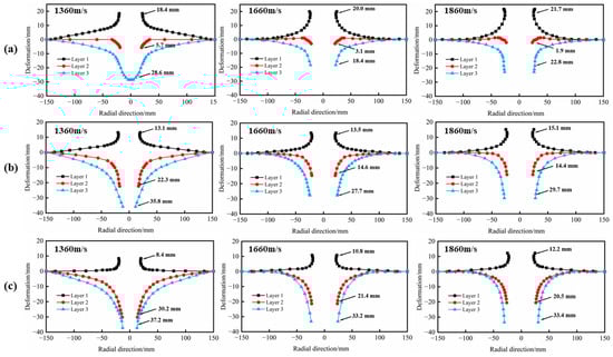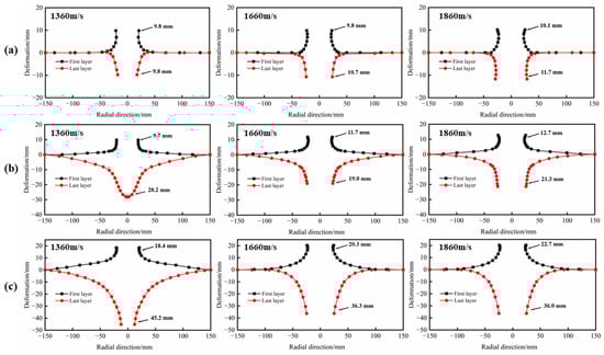 Numerical simulation deformation results of targets with different number of layers. (a) N = 1; (b) N = 2; (c) N = 6.