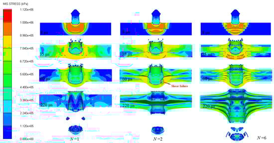 To analyze the impact of the number of layers in multi-layer targets on the ballistic performance of EFPs, simulations were conducted to obtain the penetration process of EFPs on the multi-layer targets with three different numbers of layers, as shown in Figure 17. The number of layers of stress waves remained consistent with the number of target layers, and the increase in the number of layers did not delay the propagation of stress waves in the targets, all reaching the bottom of the targets at 8 μs. As the number of layers increased, the degree of protrusion on the back of the target gradually increased at different times. Simultaneously, due to the reduction in the thickness of the single-layer target, the failure mode of the rear target transitions from shear failure to tensile failure. Although the EFP in Project 4 of Figure 4 experienced a certain deflection during the penetration process, resulting in section asymmetry, it can still be observed that as the number of layers increased, the diameter of the perforation in each layer target also increased. This was related to the different failure deformations caused by variations in target thickness.