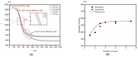 Velocity variation and residual velocity of EFP. (a) The change curves of the tail velocity; (b) residual velocity of EFP under different layers.
