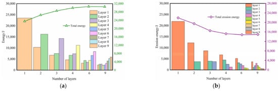 Energy distribution pattern of the targets as the number of layers changes. (a) Energy absorbed by target plate. (b) Energy dissipated by target plate erosion.
