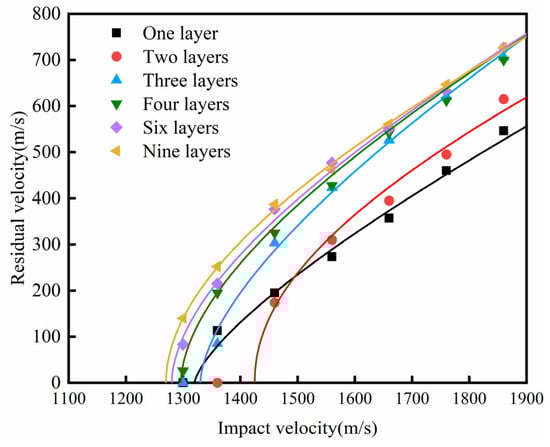 Consistent with the previous section, the final results of composite steel targets with different numbers of layers under EFP penetration at different velocities are presented in Figure 20. As can be seen from Figure 20, the impact of the number of layers on the anti-penetration performance of the targets was quite complex. After the targets were layered, the residual velocity of the multi-layer targets gradually increased with the increase in layers, and the difference in residual velocity decreased as the penetration velocity increased. The ballistic limit velocity of the two-layer target was 1425 m/s. The ballistic limits of the three-layer, four-layer, six-layer, and nine-layer targets decreased by approximately 6.67%, 9.05%, 10.18%, and 10.88%, respectively, compared to the two-layer target, with the differences gradually reducing as well. However, for a single-layer target, when the EFP velocity was greater than approximately 1500 m/s, the residual velocity was less than that of a multi-layer target; when the EFP velocity was less than about 1500 m/s, its residual velocity was greater than that of a three-layer or more-layer target but less than that of a two-layer target. The ballistic limit of the single-layer target was close to that of the three-layer target. When the EFP impact velocity was 1360 m/s, the EFP did not penetrate the two-layer target, while other layered targets were successfully penetrated. The greater the number of layers, the larger the bending deformation at the entry and exit points of the targets, and the more severe the plastic deformation of the multi-layer targets, leading to separation between the target layers. Therefore, when the EFP velocity was relatively low (penetrating a single-layer target with a velocity less than 200 m/s, as indicated by the intersection of single-layer and two-layer targets in Figure 20), the two-layer target exhibited the best anti-penetration performance to the EFP; when EFP velocity was greater than around 1500 m/s, the single-layer target showed the best anti-penetration performance to the EFP.