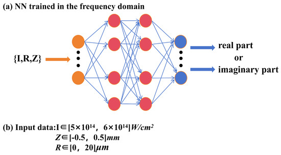 In order to simulate the harmonic emission process quickly and accurately, new calculation schemes need to be developed. Machine learning offers a solution to this challenge. In recent years, big data and various learning models, such as deep neural networks, have achieved great success in many fields, including computer vision, speech recognition, natural language processing, AlphaGo [44], AlphaFold [45], and more. In addition, machine learning programs have also been applied to many scientific fields such as drug design, new material prediction, etc. Recently, machine learning theory has been applied to numerical simulations in the field of physics. In the field of quantum physics, by learning, the density functional model can be optimized to obtain a more accurate binding energy. In recent years, machine learning has also made great progress in the field of optics and photonics. Early applications are mainly in the form of genetic algorithms [46], image reconstruction [47], aberration correction [48], or optical element design [49,50]. Subsequent work has focused on the analysis of large datasets and inverse problems; successful areas include the design of nanomaterials and structures with specific target properties [51], quantum optics [52], and optical communications [53,54,55]. Ksenia Yadav et al. discussed the key aspects of AI/ML and its significant role in enhancing optical and photonic technology capabilities [56]. In the field of laser–matter interaction, machine learning algorithms have the ability to predict the X-ray pulse characteristics of free-electron lasers [57], retrieve complex molecular structures [58,59], reconstruct femtosecond laser pulses [60], accelerate the attosecond pulse measurements’ fringe retrieval [61,62], or provide a substitute method for calculating strong-field time-dependent dynamics [63].