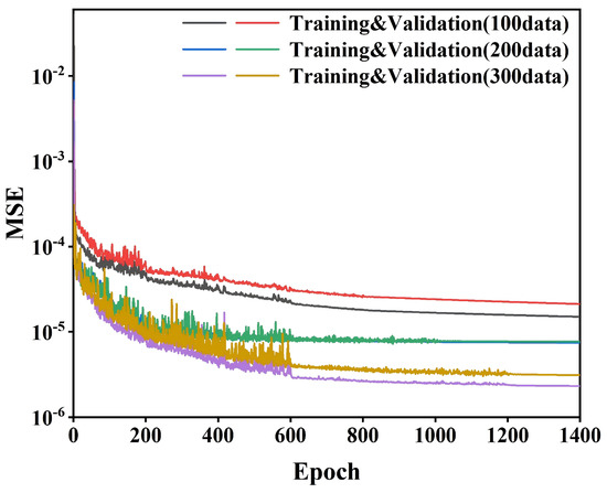 Training and validation curves of the real part of the electric field for dataset sizes of 100, 200, and 300.
