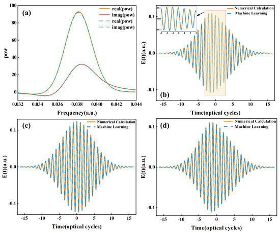 During the simulation process, the radial distance on the optical axis is taken as 0, and the propagation distance randomly varies within the range of [−. The selected laser intensity range is from to . If there is no special declaration, the training uses the Adam optimizer with a learning rate . The size of the training set here is very small: . In the frequency domain, the NN is trained using sets of 200 epochs for a growing batch size of with [73]. The training and validation of the neural network trained in the real part of the electric field for dataset sizes of 100, 200, and 300 are shown in Figure 2. As can be seen in Figure 2, we choose to use 200 training set sizes because at this size, it has been well predicted, and it can already meet our requirements for accuracy. Continue to increase the size of the training set while improving the accuracy of the prediction; it will also increase the time required to train the neural network. Specifically, for a parameter set with one fixed parameter, the whole learning process requires 200 epochs, and the eventual mean square error (MSE) is close to . Figure 3 shows the specific results of neural network simulation. Figure 3a gives the real and imaginary parts of the electric field after the Fourier transform. Figure 3b is the electric field obtained by inverse Fourier transform. It can be observed that the predicted values are almost identical to the actual values (the results obtained by numerically solving Maxwell’s equations), indicating that the model provides relatively accurate predictions for the electric field. On this basis, we give the electric field at different propagation positions when the radial distance and the laser intensity is ; as illustrated in Figure 3c,d, the propagation positions are −0.45 mm and 0.22 mm, respectively. As can be observed, there is almost no discernible difference between the two figures, indicating that within a certain range of parameters, the model is able to accurately simulate the variations of the optical field waveform with the propagation position.