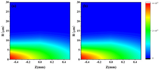 The Crank–Nicolson scheme is used to solve the above equations. The numerical simulation uses a mid-infrared laser pulse with a duration of 30 fs and a beam waist of as the initial driving laser field. A Gaussian beam’s geometry and behavior are determined by its parameters. A Gaussian beam’s geometry and behavior are determined by its parameters. The beam waist is defined as the minimum value of the beam spot size along the Z-axis. The medium used is a Ne atom gas with a length of and a pressure of 200 torr, which is positioned at the focus of the laser pulse.
