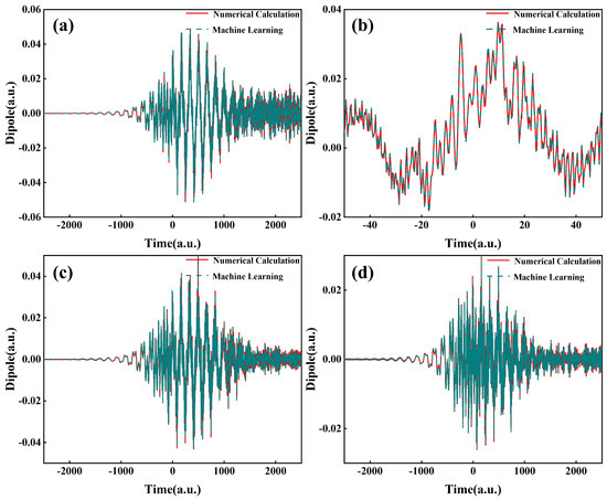 Dipole moments at different propagation positions when the radial distance , the laser intensity is . (a) propagation position is −0.5 ; (b) partially enlarged details of (a); (c) propagation position is 0 mm; (d) propagation position is 0.5 mm. The red solid line represents the true value, and the green dotted line represents the predicted value.