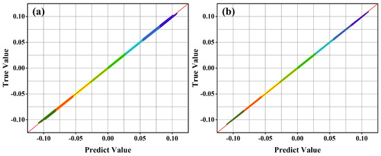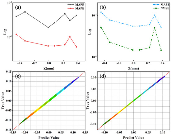 Considering that the statistical criterion itself does not reflect the difference between the predicted and true values, we calculate the distribution of the predicted and true values of the electric field, as illustrated in Figure 6c,d. The horizontal axis represents the predicted value of the electric field, while the vertical axis depicts the true value of the electric field. If the points are situated on the diagonal line, it can be concluded that the predicted value is equal to the true value. As illustrated in the figures, the points are concentrated on both sides of the diagonal line, which indicates the accuracy of the model’s predictions.