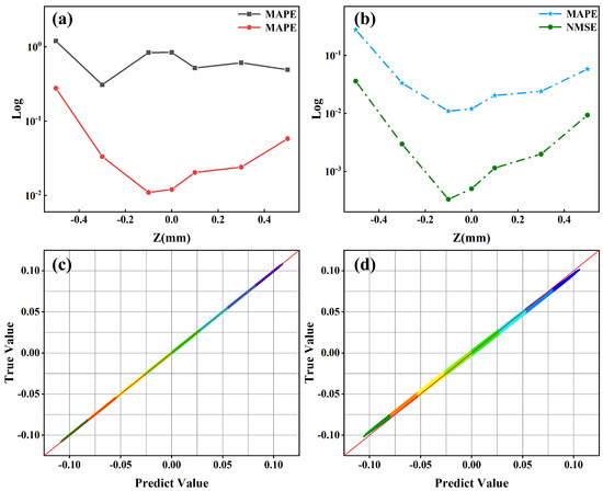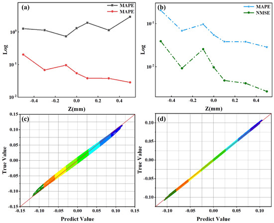 (a,b) are statistical criteria for model prediction results. (a) MAPE. The black represents all the points of the light field, and the red line represents the points greater than of the peak intensity of the light field. (b) MAPE and NMSE at different propagation positions. (c,d) are the distributions of electric field predicted value and true value. (c) , the laser intensity is , and the propagation position is −0.10; (d) , the laser intensity is , and the propagation position is .