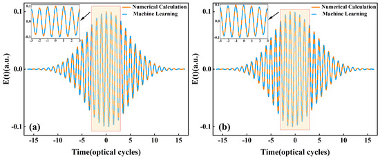 Two examples of predicting electric fields using transfer learning techniques. (a) , the laser intensity is , and the propagation position is −0.4; (b) , the laser intensity is , and the propagation position is . The orange solid line represents the result of numerical calculation, and the blue dotted line represents the result of neural network prediction. Activation function: tanh, .