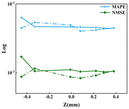 When the laser intensity is set as and the radial distance is set as 0, we present the MAPE and NMSE calculated based on the true values and predicted values at seven different propagation positions. Considering the requirement of the MAPE evaluation metric that the true values cannot be zero, we add 0.1 to both the true values and predicted values, as shown in Figure 6. Here, the horizontal axis shows the onset of different propagation positions, while the vertical axis is in logarithmic scale. As can be seen from the MAPE formula, the value of the numerator has a major effect on the result. Since the generation of harmonics mainly originates from the electric field with a larger amplitude, we select the points with intensities greater than of the peak intensity of the optical field for error analysis. It can be seen from Figure 6a that the errors of these points are less than the error for all points in the optical field, thus allowing for more accurate results. In Figure 6b, as the propagation distance increases, the predictive performance of the model remains relatively stable, with the MAPE staying at around and the NMSE staying at around (unless otherwise stated, the points selected for the following error analysis are those with intensities greater than of the peak intensity).