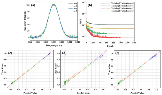 (a) Training data under different Gaussian white noise; (b) Training and validation curves of the real part of the electric field, for noise of , 3; (c–e) The distribution of the real part of the electric field predict value and true value. (c) ; (d) ; (e) .