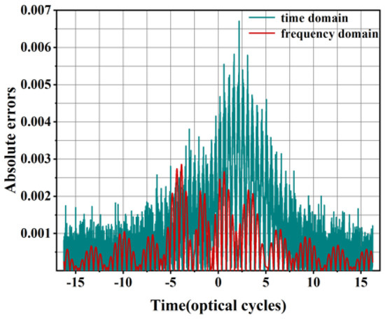 Unlike the numerical simulation in the time domain that provides intuitive results, the frequency–domain expansion results presented in this study save more computational resources. Figure 13 shows the absolute errors (the absolute value of the difference between the predicted value and the true value) of the model predictions in the time domain and frequency domain. Here, 200 grid points have been selected for the frequency–domain calculation, while 16,384 grid points have been chosen for the time domain. As can be seen from the figure, the frequency–domain model can achieve comparable or even better accuracy with fewer computational resources compared with the time–domain model.