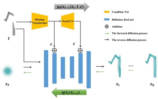 Denoising Diffusion Probabilistic Models (DDPMs) [,,] have emerged as a promising approach for generating high-quality and diverse images. Unlike traditional generative models, such as variational auto-encoders (VAEs) [] and generative adversarial networks (GANs) [], the DDPM constructs a forward diffusion process by incrementally adding noise to data points and learns the reverse denoising process to generate new samples. One advantage of the DDPM is its ability to handle complex data distributions, making it suitable for modeling point clouds where traditional methods may struggle because of limitations in stability or flexibility. The DDPM has demonstrated impressive results in generating images with diverse and realistic characteristics. Moreover, the DDPM has proven effective in tasks such as super-resolution and deblurring, which require unique ground truth because it captures complex data distributions to accurately reconstruct images [,]. In summary, the DDPM offers a powerful alternative to traditional generative models for modeling images. Its forward diffusion process and reverse denoising process enable the synthesis of high-quality and diverse images, making it a valuable tool in various image-related tasks.