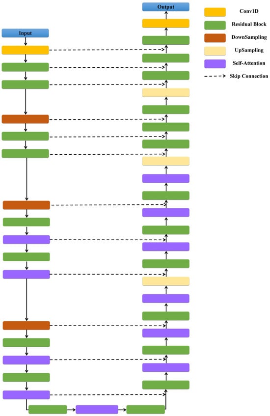 The architecture of our Diffusion ResUNet combines elements from both ResNet and the symmetric UNet, like encoder–decoder architecture, as detailed in Figure 2. This hybrid structure integrates Residual blocks, DownSampling and UpSampling blocks, Self-Attention mechanisms, and Skip Connections. Each Residual block consists of two convolutional blocks, each comprising Group-Norm [], SiLU activation [], and convolutional layers, as depicted in Figure 3. Within the Residual block, the time-step embedding undergoes SiLU activation before undergoing linear transformation. Subsequently, it is added to the output of the first convolutional block. Skip Connections connect features with the same resolution in the encoder and the symmetric decoder. The condition features are seamlessly integrated into both the encoder and decoder stages of the ResUNet network, facilitating the incorporation of latent information about the target point cloud shape (as shown in Figure 1). Finally, a standard convolutional layer is employed to make predictions for the final output. This comprehensive architecture harnesses the strengths of both ResNet and symmetric UNet, enabling our model to effectively capture intricate details and dependencies within the data, thereby enhancing the quality and fidelity of the generated complete point clouds.