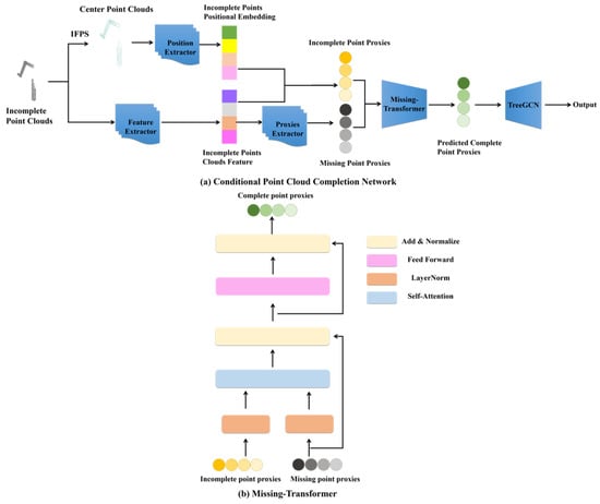 Structures of the proposed conditional point cloud completion network (a) and Missing-Transformer (b).