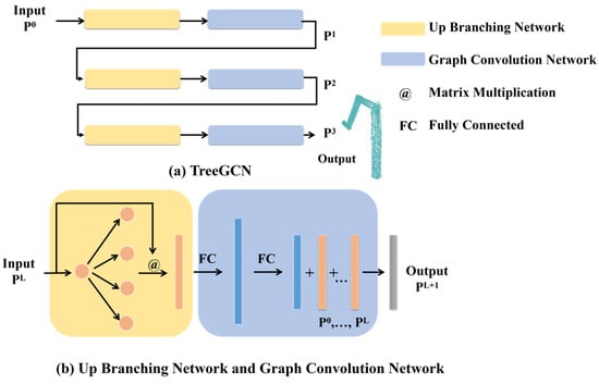 Then, we utilize TreeGCN [] to recover complete point clouds. Figure 5a illustrates its structure, comprising 3 layers. TreeGCN is composed of Up Branching Networks and Graph Convolutional Networks (as shown in Figure 5b). The Up Branching Network serves to increase the number of features. Initially, the input features is expanded through linear transformation to increase their quantity by , followed by matrix multiplication (@) to obtain the expanded features. The expansion process is defined as