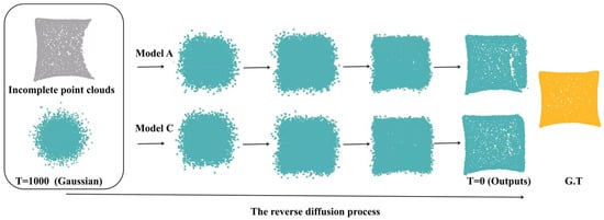 To validate the effectiveness and necessity of the proposed conditional point cloud completion network and Missing-Transformer, we tested and compared our method PCCDiff with its variants on ShapeNet-34/21. The results of the ablation study are presented in Table 3. Model A is the variant of the PCCDiff without both the conditional point cloud completion network and Missing-Transformer, which aims to demonstrate the effectiveness of introducing condition features into the network design. The CD increases markedly upon removal, indicating that condition features significantly improve performance. Figure 8 visually demonstrates the intermediate steps of the diffusion reverse process. It can be seen that Model C generates more complete point clouds than Model A. The condition features provide multi-level information during the diffusion process, including local and global features. The reverse diffusion process can effectively utilize condition features to manipulate the noisy input point cloud to form a clean and complete point cloud. When removing Missing-Transformer from the conditional point cloud completion network (Model B), the CD is higher, as expected. It clearly shows that Missing-Transformer can bring performance improvement. Notably, our method, PCCDiff (Model C), achieves the best performance compared to its variants, confirming the effectiveness of its design.