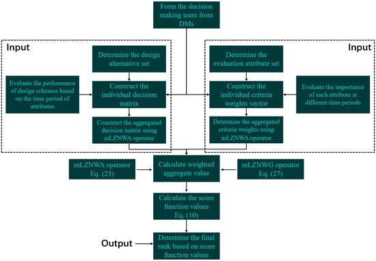 Existing methods for dynamic MAGDM face challenges in capturing the temporal evolution of attributes and integrating DMs’ confidence levels [9,16,17], often relying on static models that lead to incomplete or unreliable evaluations. To address these gaps, we propose the mLZN framework, which combines the dynamic modeling capabilities of mFS [18] and LZN [19]. mFSs are advanced mathematical models that allow for the representation of multiple evaluations for the same attribute under different conditions or periods through distinct “poles” [20,21]. Each pole corresponds to a specific temporal state or scenario, enabling dynamic modeling of attribute performance over time. For example, in evaluating adaptive furniture design, mFSs can represent variations in size, safety, and functionality across different growth stages of a child, providing a comprehensive view of the attribute’s evolution. On the other hand, LZNs enhance traditional fuzzy logic by incorporating both a linguistic evaluation of an attribute (e.g., “high safety” or “moderate comfort”) and a linguistic representation of the confidence level in that evaluation (e.g., “very confident” or “uncertain”) [19,22,23]. This dual-component structure addresses the uncertainty and variability inherent in decision-making by offering a clear and intuitive assessment while capturing the reliability of the evaluations. By combining these two techniques, the mLZN framework enables a dynamic and comprehensive evaluation of adaptive design concepts. The temporal modeling capabilities of mFSs are complemented by the uncertainty-handling and confidence-representation strengths of LZNs, making the method particularly suitable for dynamic, multi-attribute decision problems where both the evolution of attributes over time and the reliability of evaluations must be considered. This integration is expected to provide a robust solution to the limitations of traditional MAGDM methods, ensuring reliable and actionable decision-making in the context of adaptive design.