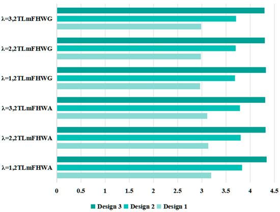 Next, we use these four aggregation operators, combined with the attribute weights in Table 4, to calculate the final score value for each design scheme. It is worth noting that the Hamacher aggregation operator is controlled by parameter λ. When λ = 1, the mFHWA and mFHWG operators degenerate into m-polar fuzzy weighted average and m-polar fuzzy geometry operators, respectively. The 2TLmFHWA and 2TLmFHWG operators degenerate into two-tuple linguistic m-polar fuzzy weighted average and two-tuple linguistic m-polar fuzzy weighted geometry operators, respectively. When λ = 2, the mFHWA and mFHWG operators are transformed into m-polar fuzzy Einstein weighted average and m-polar fuzzy Einstein geometry operators. The 2TLmFHWA and 2TLmFHWG operators degenerate into two-tuple linguistic m-polar fuzzy Einstein weighted average and two-tuple linguistic m-polar fuzzy Einstein weighted geometry operators, respectively. We discussed the decision scenarios for λ = 1, 2, and 3 separately, as shown in Table 10 and Table 11. We visualized the crisp scores of every design obtained using all operators, as shown in Figure 3 and Figure 4.