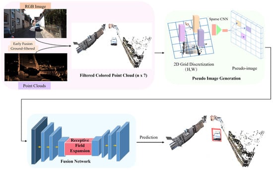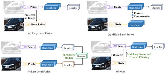 46] strategy processes each sensor data point on its independent detection module and joins the 2D and 3D results based on interrelationships or special models. It ignores the potential information generated by the performance of each sensor, involving less interaction between different modalities. Both the middle- and late-level strategies must apply two independent networks to extract the features of each modality, making it hard to achieve the optimal point-wise correspondence. Their performance is limited by 2D mature detectors. As the early-level strategy records two modes into a consistent coordinate system, which can realize the fusion of limited perception data, it simplifies the design and improves the efficiency of convolutional coding. Nevertheless, early-level fusion methods have not been thoroughly explored yet, and we aimed to fill this gap and expand the current knowledge in this field.