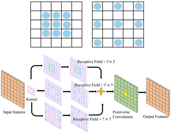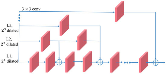 The skip connection operation is applied in the receptive field module due to the different dilated convolutions in each level. When the skip connection is denoted as T, the dilation size can be represented as (t, t = 1, 2, 3), expanding the receptive field.