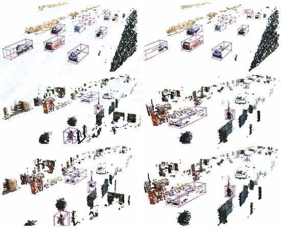Table 1, the detection results using the 7D color point cloud as the input surpassed those obtained with the 3D data in all three categories: vehicles, pedestrians, and cyclists. Especially in the categories of pedestrians and cyclists, the accuracy improvement from using the 7D color point cloud was more obvious, with improvements of 1.37% and 1.75% at the difficulty level of “medium”, respectively. The reason for this is that color information enriches the semantic content. Additionally, the feature fusion network, which incorporates an expanded respective field, exhibited distinct advantages in detecting objects over long distances. To gain an intuitive understanding of the detection performance, this paper compared the predicted results with the ground truth by using a 3D bounding box, and the visualization results are presented in