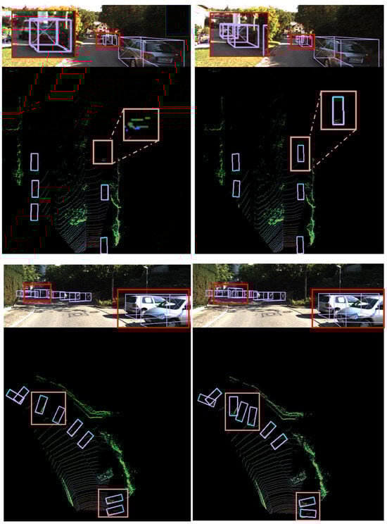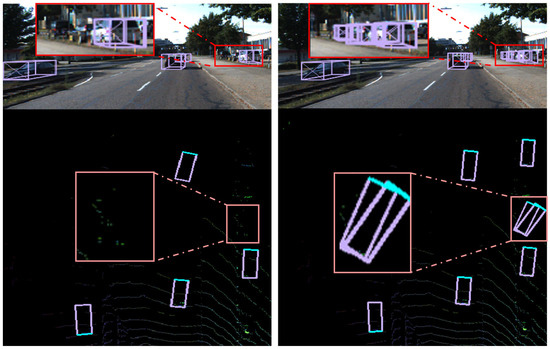 Figure 9 further provide a qualitative analysis by visualizing the detection results in the case of partial occlusion and distant objects. The left column is the visualization result of PointPillars, and the right is the visualization result of the 2SFNet. Red and pink highlights the critical regions in images space and 3D space. The purple indicates the vehicles, while blue represents the orientation.