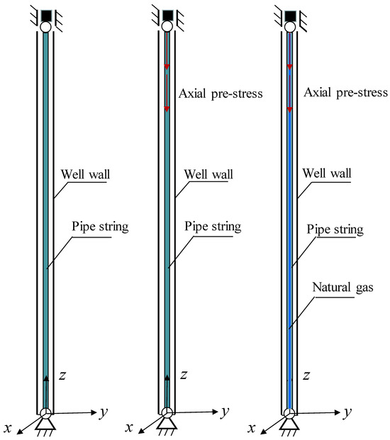In the absence of injection–production, the deformation of the pipe string will cause accumulation in the bottom hole under the action of gravity, and the pipe string will exhibit sinusoidal buckling or spiral buckling near the packer position, and these types of buckling are in a central symmetric state. If natural gas with fluctuating pressure is passed through the pipe string, the state of the string will be changed. The mechanical model of the injection–production pipe string with different load conditions is shown in Figure 1.