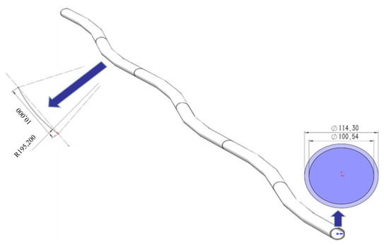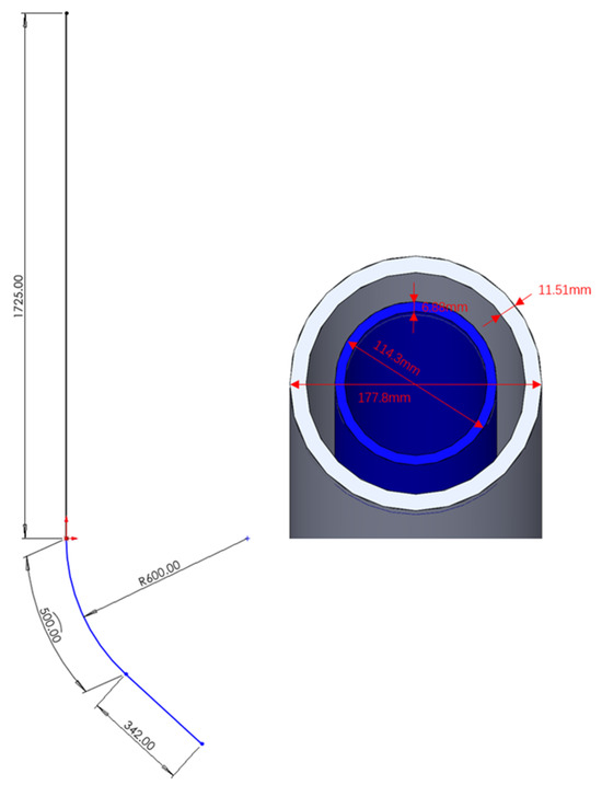 Taking a gas storage well as an example, the length of the pipe string in the vertical section of the well is 1725 m, with an arc length of 500 m in the inclined section, a curvature radius of 600 m, a length of the stable inclination section of 234 m, and a final inclination angle of 47.75°. The injection–production pipe string material is constructed from 13Cr, with specific parameters as follows: a pipe outer diameter of 114.3 mm, a thickness of the pipe wall of 6.88 mm, a density of 7850 kg/m3, a Young’s modulus of 210 GPa, and a Poisson’s ratio of 0.3. Based on well structure parameters, a full-size geometric model of a gas storage injection–production pipe string is established, and the geometric model of the pipe string is shown in Figure 2.