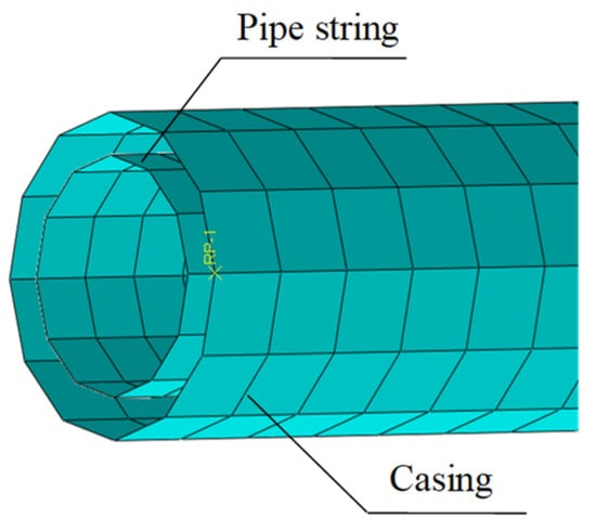 Through the numerical analysis method, the pipe geometric model is divided into grids, and the finite element analysis model of the whole pipe string is established. The finite element model of the injection–production string adopts a shell element. The shell element is also used in casing. The outer diameter of the casing is 177.8 mm, and the wall thickness is 11.51 mm. Therefore, the casing diameter is 154.78 mm; because the casing is completely in contact with the formation without deformation, it is defined as rigid body. The finite element analysis model of the pipe string and casing is shown in Figure 3.