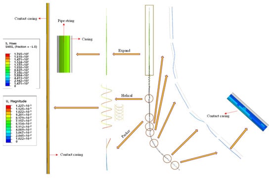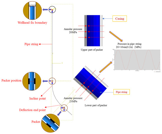 It is assumed that the entire model is under a gravity condition of g = 9.8 m/s2. At the same time, the top of the pipe string is fixed. The rigid casing body is coupled to the point on the casing, and it is completely constrained. The packer is located 100 m away from the deviation point in the vertical well section, and the hanger is located 100 m away from the deviation end point in the stable inclination section. The boundary conditions of the pipe string are shown in Figure 4.