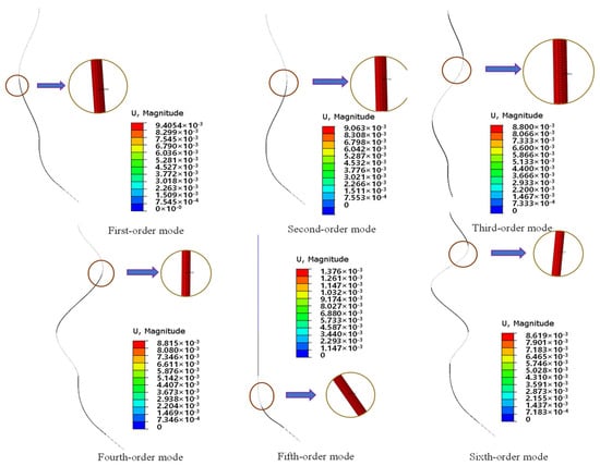 From the modal analysis results, it can be found that the natural frequency of the whole string system is very small (on the order of 10−4), and it can be determined that the slight disturbance of the pipe string by the external load may cause the vibration of the pipe string; when the vibration frequency of the external load is close to the natural frequency of the pipe string, pipe resonance will occur.