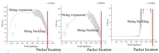 Under three different annular pressures (10, 15, and 20 MPa), the pipe string displacement along the well depth is analyzed, and the results are shown in Figure 7. It is found that radial expansion occurs when the annular pressure is small. The injection–production pipe string shows serious bucking near the packer position. The buckling of the injection–production pipe string is slightly smaller under 25 MPa, and it has a central symmetry.