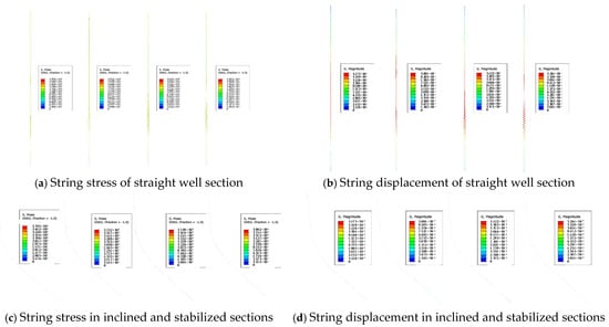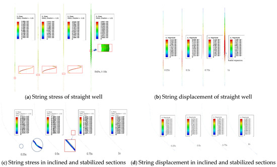 Considering the influence of the casing annulus pressure, string gravity, and internal pressure, when the gas pressure vibration frequency of the injection–production pipe string is 0.1 Hz, the stress and deformation of the injection–production pipe string are shown in Figure 8.