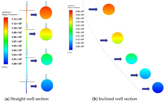 According to the analysis results from the pressure nephogram, there is little difference in fluid pressure in the straight pipe section. However, due to the gravitational effect causing pipe buckling, there is a pressure difference in the buckling section of the pipe string, and the greater the curvature radius of the buckling section, the greater the corresponding pressure difference between the inside and outside of the pipe. Therefore, the existence of a pressure difference easily causes the pipe string to shift to one side, resulting in the deformation of the pipe string. If the pressure difference is variable, it can easily induce the vibration of the pipe string. In the inclined section, the fluid pressure in different positions across the pipe section is different. Specifically, the fluid pressure is higher on the inner side and lower on the outer side of the inclined section. Consequently, during the fluid flow process, the variation in fluid pressure causes pressure variation on both sides of the pipe string, and it causes the vibration of the pipe string.