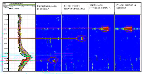 High-precision distributed fiber-optic logging is used to find the leak points and identify abnormal stress points in the wellbore pipe string. The distributed fiber logging system is composed of a test fiber and a distributed fiber vibration demodulator instrument. The fiber cable size is 5.9 mm, the spatial resolution is 2 m, and the detection frequency is 10 KHz. The abnormal stress point monitoring of the downhole pipe string in a well interval of 0–2461.62 m is completed in this well. Leakage points are identified in the pipe string of the injection and production well at 682.0 m, 2046 m, 2144 m, and 2368 m (as shown in Figure 12), and the leakage points are mainly located at the collar position.