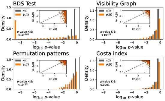 Comparison of the probability distributions of the of the p-values, for, respectively, the original time series (grey bars), and the transformation (orange bars). Each panel reports the results for an irreversibility test, as described in Section 2.2. The insets further depict scatter plots of the of the p-values of , as a function of those of ; for reference, the dashed grey line represents the main diagonal. Finally, the text in each panel reports the p-value of a two-sample K-S test between the two probability distributions. Results correspond to time series of length .