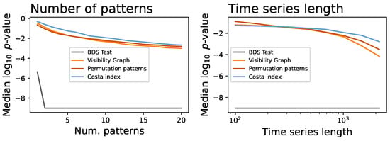 In order to obtain homogeneous results, I resort to the strategy proposed in refs. [,], involving the generation of a large set of random COPs . For each one of them, the previous process is repeated—i.e., the time series is transformed into and the irreversibility test is applied to it; finally, the transformation yielding the lowest p-value (i.e., the highest irreversibility) is retained. The left panel of Figure 2 reports the evolution of the median of the obtained p-values, as a function of the number of generated random patterns. It can be appreciated that 20 random patterns are enough to obtain time series that are irreversible in a statistically significant way (i.e., p-value ) in the majority of cases. It is also interesting to observe the wide difference between the BDS test on the one hand, and all other tests on the other; this is due to the fact that the former not only assesses irreversibility, but is rather designed to detect the presence of non-linearities in general. I finally evaluate the role of the time series length, obtaining that longer time series are associated with slightly smaller p-values; see the right panel of Figure 2.