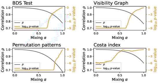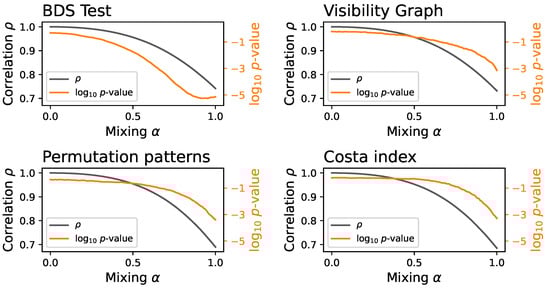 Figure 3 reports the evolution of the correlation coefficient between and , and of the median of the of the p-value of the irreversibility test applied to , as a function of the mixing . It can be appreciated that, as increases, the resulting time series are more irreversible but also less similar to the original one—as expected by construction. Still, in all cases, it is possible to find a value of for which the p-value is below (i.e., the time series can be considered irreversible) while still displaying a .