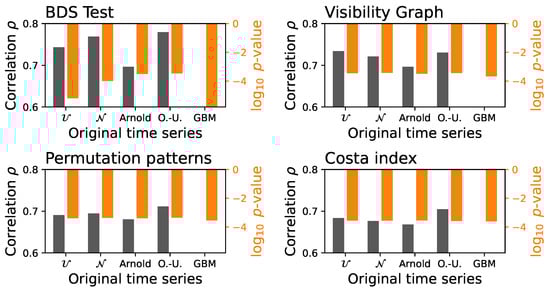 As can be seen in Figure 4, all cases behave mostly similarly; the notable exception is the GBM process, yielding a very low correlation coefficient (always below , not reported for the sake of clarity). In other words, starting from time series that are time-reversible, the final result of the process can be different. Taking into account that the optimisation process is the same in all cases, this indicates that different time series are differently predisposed to become irreversible, or that the efficiency of the process changes depending on the nature of the analysed time series—in other words, that a “distance to irreversibility” can be defined. This will further be used in Section 4.