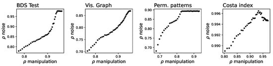 Figure 5 presents results similar, albeit slightly worse, than the previous case. Specifically, with values of close to 1, it is possible to obtain reversible time series, with correlations between and . The fact that lower correlations are obtained is not surprising, considering that the transformation induced by COPs is a non-linear one; this transformation thus naturally tends towards higher irreversibilities, and is here applied to obtain the opposite result. Additionally, and as previously mentioned, irreversibility can easily be reduced by introducing noise in the time series. I tested this idea by starting from time series generated with the Logistic map, then adding noise drawn from a uniform distribution until the irreversibility fell below what was obtained by the proposed transformation. Figure 6 then reports the average , as obtained when introducing noise, as a function of the one obtained with the COP manipulation. Results are similar, except in the case of the Costa index: small quantities of noise are enough to confound this test and obtain large p-values, consequently obtaining time series very similar to the original ones. In sum, while the addition of an observational noise may be more efficient, the proposed optimisation procedure is still valid to reduce the irreversibility of time series.